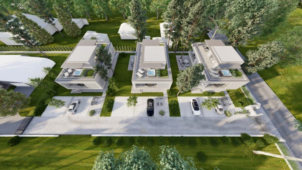 Ezért a közel 1 hektáros területet felosztottuk három részre. Jelenleg felújítás alatt áll egy gyönyörű villa épület, amely 1900-as évek elején épült. A villa épület mellett még egy modern, futurisztikus családi villa foglal helyet. Ezen felül szerettük volna a terület többi részét is hasznosítani ezért 3 db külön álló épületben terveztünk összesen 6 db lakást. Az első ütem kivitelezése 2021. júniusában kezdődik meg, amely az A épületet foglalja magába.