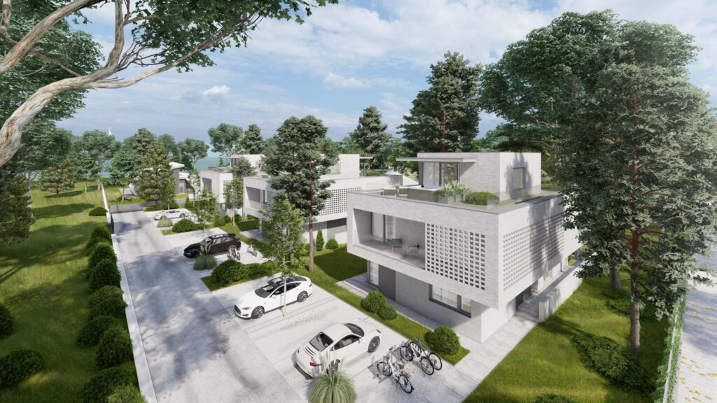 Az épületegyüttes nem próbál konkurálni a Balaton partra sajnos egyre jobban jellemző nagyméretű társasházakkal, lakóparkokkal. Az épületek az égbe tornyosuló fatörzsek közé ékelődnek be, amely minőségi, exkluzív és családias életkörnyezetet kíván biztosítani. A szabadonálló telepítéssel, teljes négyirányú benapozottsággal, udvarkapcsolattal, panorámás erkélyekkel és tetőterasszal csak néhány család részére történő ritka és különleges életforma létrehozása a cél.